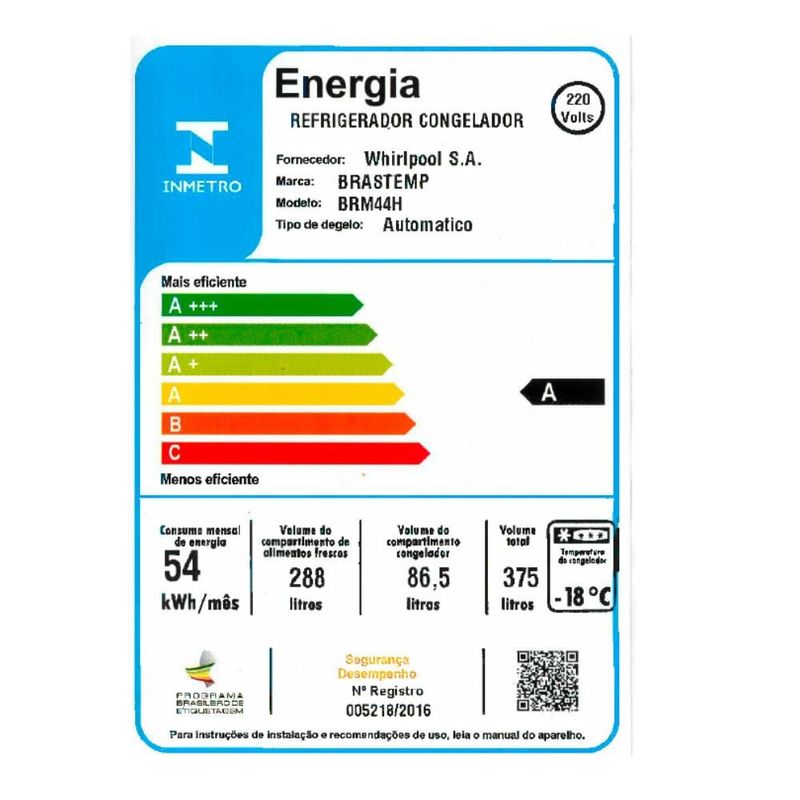 Geladeira Brastemp BRM44: Frost Free Duplex, 375 litros de capacidade, eficiência energética classe A e controle eletrônico.
