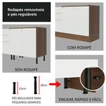 Outro diferencial desta cozinha são os pés reguláveis em PVC e os rodapés removíveis em MDP, que facilitam a limpeza. O balcão comporta pias de inox ou pedra, no espaço de 150 x 52 cm.