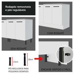 Qualidade não vai faltar na sua cozinha, já que este armário possui puxadores com alça em alumínio, gavetas com corrediças telescópicas de abertura total, portas com amortecimento para fechamento suave, vidro reflex no aéreo e pés reguláveis em PVC.
