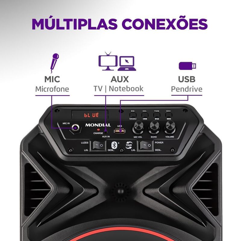 Caixa de Som Portátil Amplificada Mondial: Potência de 250W RMS, conectividade Bluetooth e bateria para animar seus eventos em qualquer lugar.