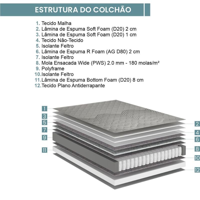 Desfrute de noites de sono verdadeiramente reparadoras com o Colchão Casal Ecoflex Relax Comfort. Sua estrutura de molas ensacadas Wide oferece suporte individualizado, enquanto o nível de conforto firme garante o alinhamento ideal para a coluna. Com tecido em malha respirável e Pillow Top, proporciona maciez e frescor. Incorpora tecnologia No Flip, tratamento antiácaro e sistema Polyframe, que reforça as bordas, ampliando a área útil do sono e prevenindo deslizamentos graças ao tecido antiderrapante.