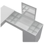 A Escrivaninha de canto com penteadeira Princesa tem como destaque seu design moderno e despojado. Além das funcionalidades de uma escrivaninha, possui nicho organizador para objetos e joias, com vidros de correr, contendo também um painel com espelho fixo. Pois praticidade é tudo, não é mesmo? Possui porta convencional com uma prateleira interna e dobradiças metálicas, pintura UV, acabamento fosco. Com a combinação perfeita de qualidade e durabilidade tudo isso para completar sua casa