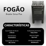 Com o Fogão Braslar Sirius Plus, sua rotina na cozinha se transforma. Experimente a agilidade no preparo de pratos com suas chamas potentes e o conforto do acendimento automático, que simplifica cada uso. Este eletrodoméstico foi pensado para quem busca eficiência e um toque de refinamento. Seu design contemporâneo e a superfície de fácil limpeza garantem que sua cozinha permaneça sempre impecável e convidativa. Invista em excelência e funcionalidade para o coração da sua casa.